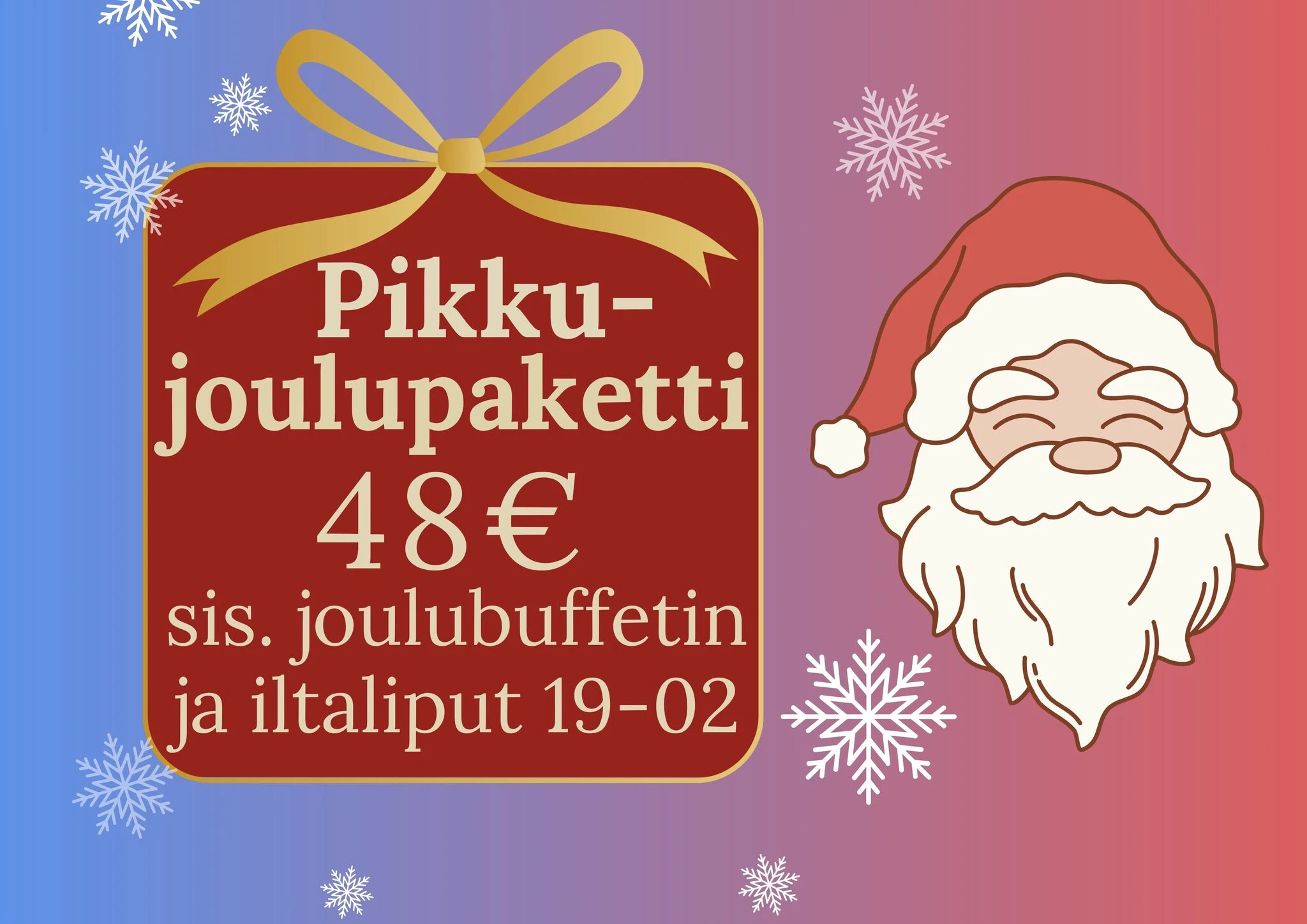 PIKKUJOULUPAKETTI 48€ - sisältää narikkamaksut, pöytävarauksen jouluisine kattauksineen, joulubuffetin ja iltaliput